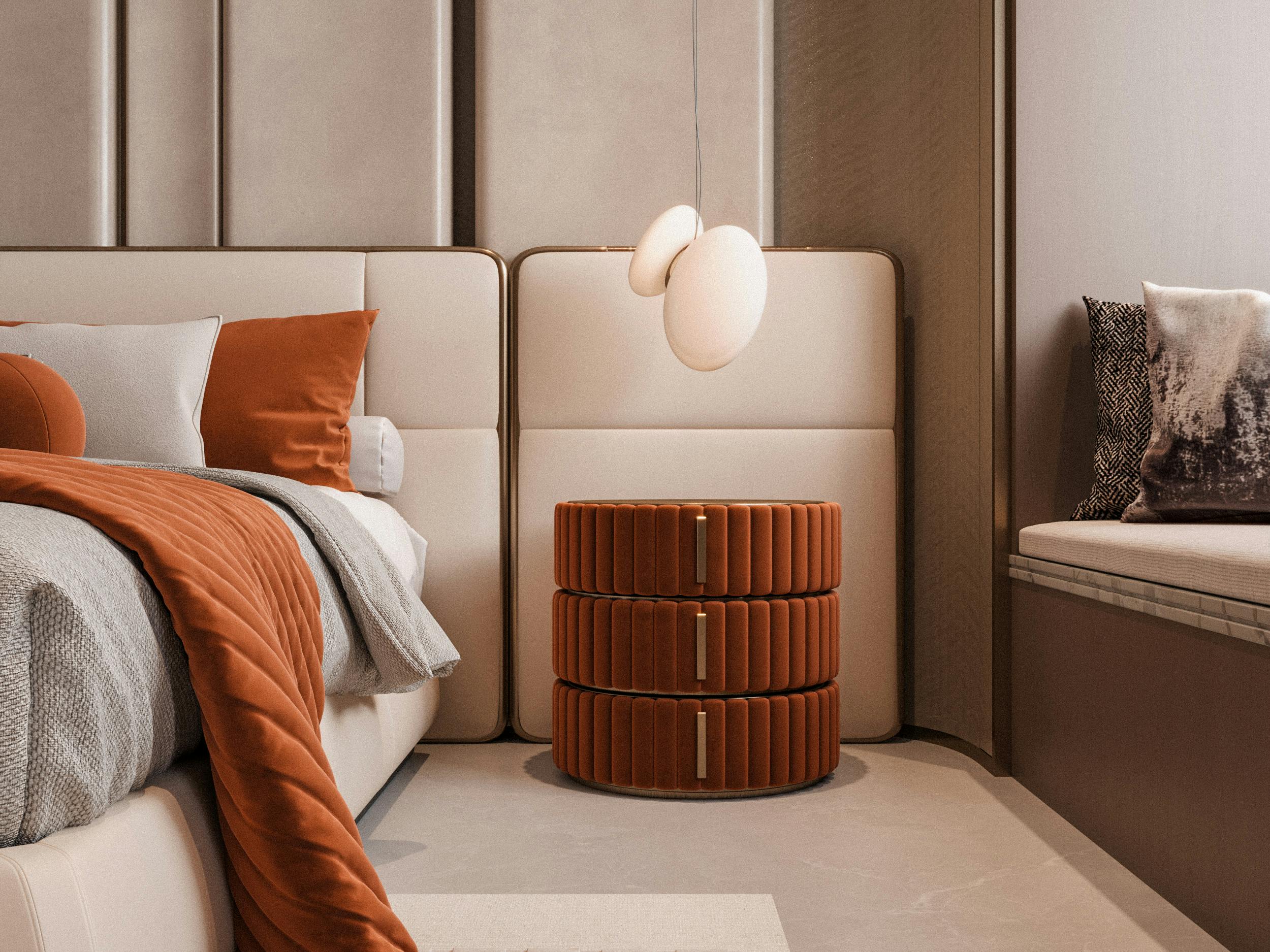 A mesa de cabeceira Monza é uma peça de mobiliário que une sofisticação, modernidade e funcionalidade em um design escultural. Seu visual arredondado, com acabamento estofado em tecido texturizado, proporciona uma sensação de aconchego e requinte, ideal para ambientes de descanso como quartos sofisticados e suítes de alto padrão.